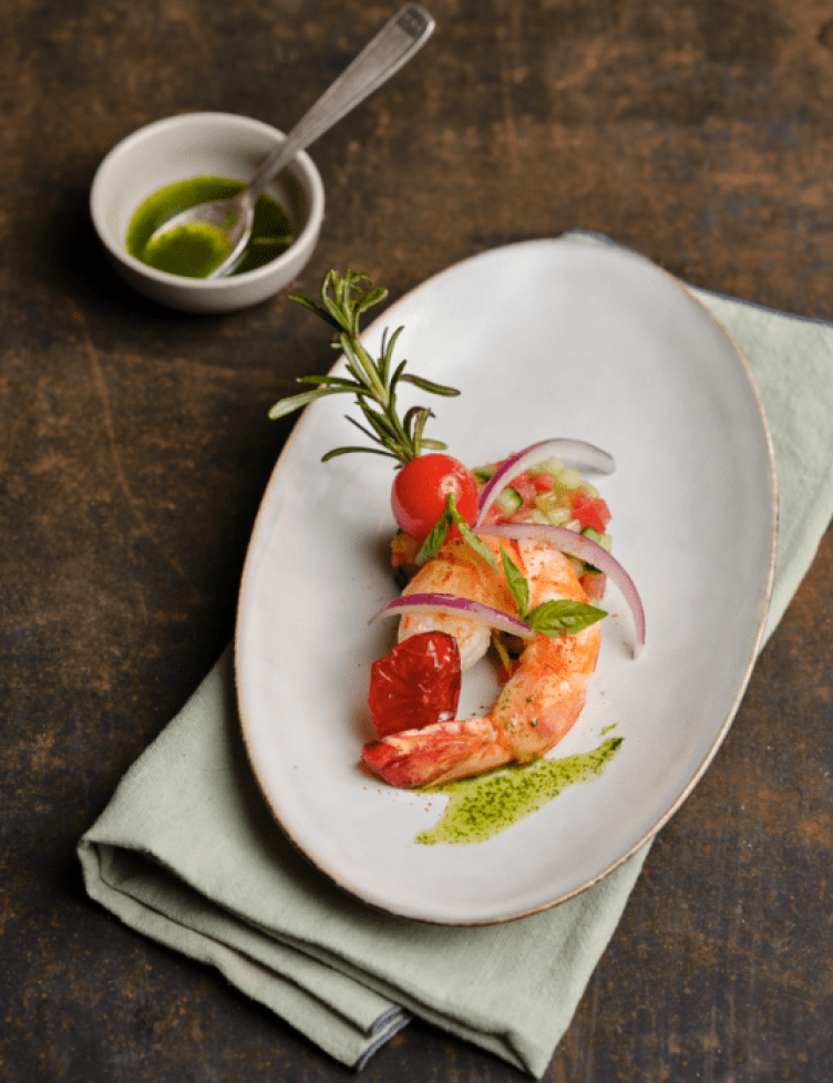 - Disposez harmonieusement le mélange de tomates et concombre sur l’assiette et déposez dessus une brochette de gambas. Décorez avec un pétale de tomate confite, quelques lamelles d’oignons rouges et des feuilles de basilic. Pour finir, versez un filet d’huile d’olive mélangée à du pesto.