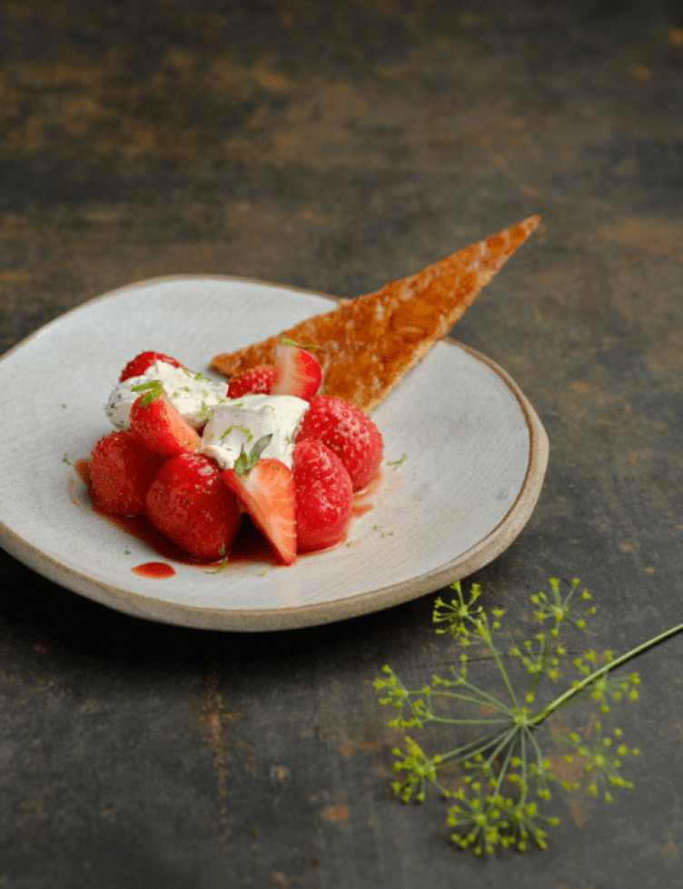 - Disposez dans une assiette creuse le jubilé de fraises, rangez autour une corolle de fraises Gariguettes coupées en 4 et nappées du jus de jubilé. Ajoutez la glace vanille et le zeste de citron vert. Décorez avec l’Arlette croustillante.